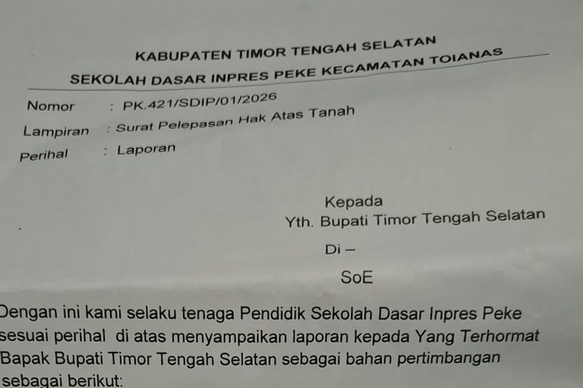 Kepala SD Inpres Peke, Terianus Tafuli, secara resmi melayangkan surat kepada Bupati TTS terkait dugaan perubahan fungsi lahan tersebut. Surat bernomor PK 421/SDIP/01/2026 tertanggal 7 Januari 2026 itu juga ditembuskan kepada Ketua DPRD Kabupaten TTS, Kepala Dinas Pendidikan dan Kebudayaan, Kepala Dinas Perindagkop, Kepala Badan Kesbangpol, serta Kepala Badan Pengelola Keuangan dan Aset Daerah (BPKAD) Kabupaten TTS.