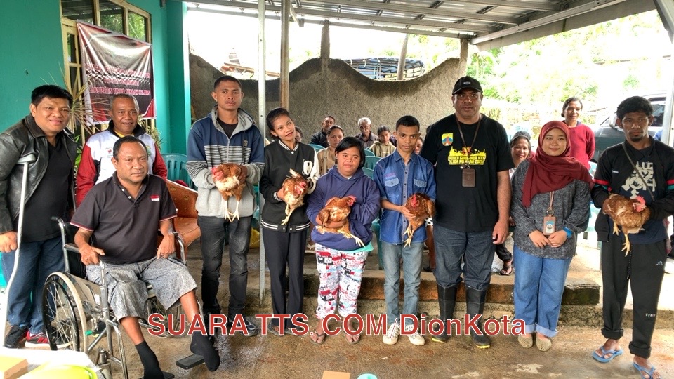Ket. Foto : Nampak Kepala Dispora Kab TTS sedang menyerahkan bantuan ayam petelur kepada pemuda penyandang distabilitas