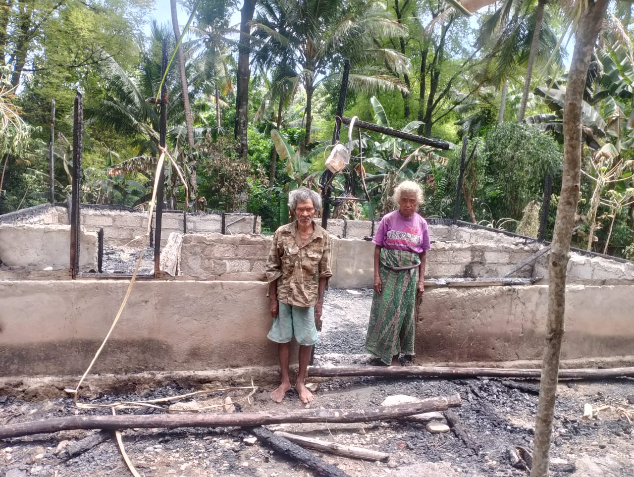 “Semua alat dapur, pakaian, serta uang tunai sekitar Rp5 juta, dan barang-barang berharga lainnya ikut terbakar. Meteran listrik juga hangus,” ungkap salah satu warga di lokasi kejadian.KetKet foto : Musa Taneo dan istri berpose di depan rumah yang ludes terbakar